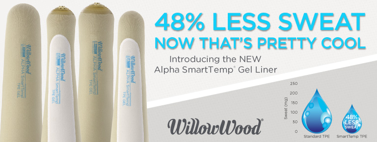 The Alpha SmartTemp® Gel Liner is constructed with WillowWood’s proprietary blend of Thermoplastic Elastomer (TPE) gel and heat absorption technology. This technology allows the liner to absorb and store heat from a residual limb, delaying the onset of sweat. The liner releases the stored heat as the body cools down, stabilizing the skin temperature to keep the user comfortable all day. The transtibial liner features a flexible knee panel of abrasion-resistant fabric that allows for easy flexion without pulling and tightening at the knee.